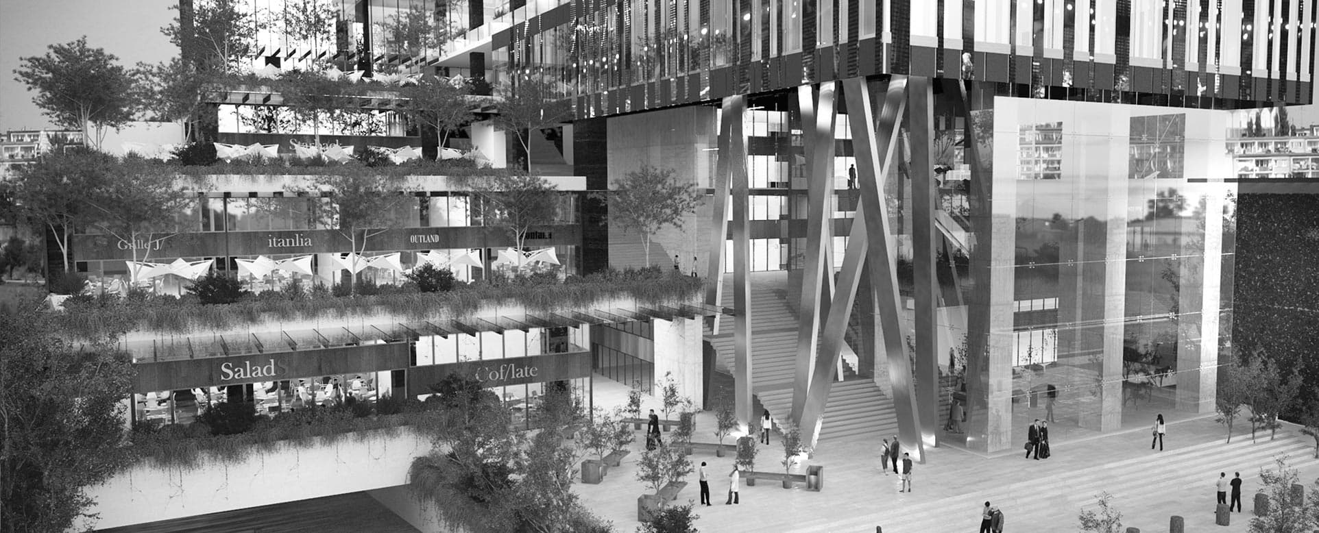 Proyecto de usos mixtos con 30 niveles de altura que incluyen área comercial, área de oficinas y departamentos.